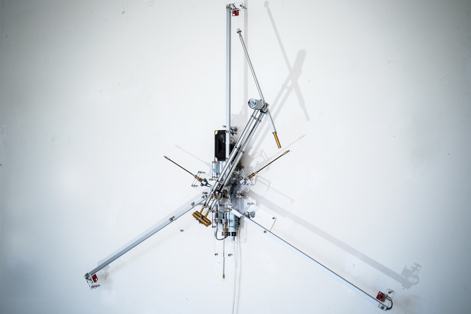 The modulator is a system consisting of electric motors and a composite hand, with a passive magnet installed at the end. The Hall effect sensors register the movements of the magnet. This only occurs if the rotation phases coincide in such a way that both composite parts of the hand with the magnet at the end and the senor are on one line. After registration of the magnet’s movements, the status of the entire system shifts -– there is a change of pace, the direction of the rotation of one or both motors changes, and most importantly - the parameters of the sound synthesis. The more frequently the system mutates, the more complex the sound becomes and vice-versa, the more infrequently, the tone becomes more diffuse. As the Hall effect sensors register not only the existence of a magnetic field, but also its strength and polarity, another three additional magnets have been installed on the object on the rotating axes which modulate the position of the main magnet when it is all of a sudden in close proximity to them. Taken all together, they form a composite dynamic system in a closed loop and in a constant state of mutation and modulation of its state rotating in an endless sound composition.
